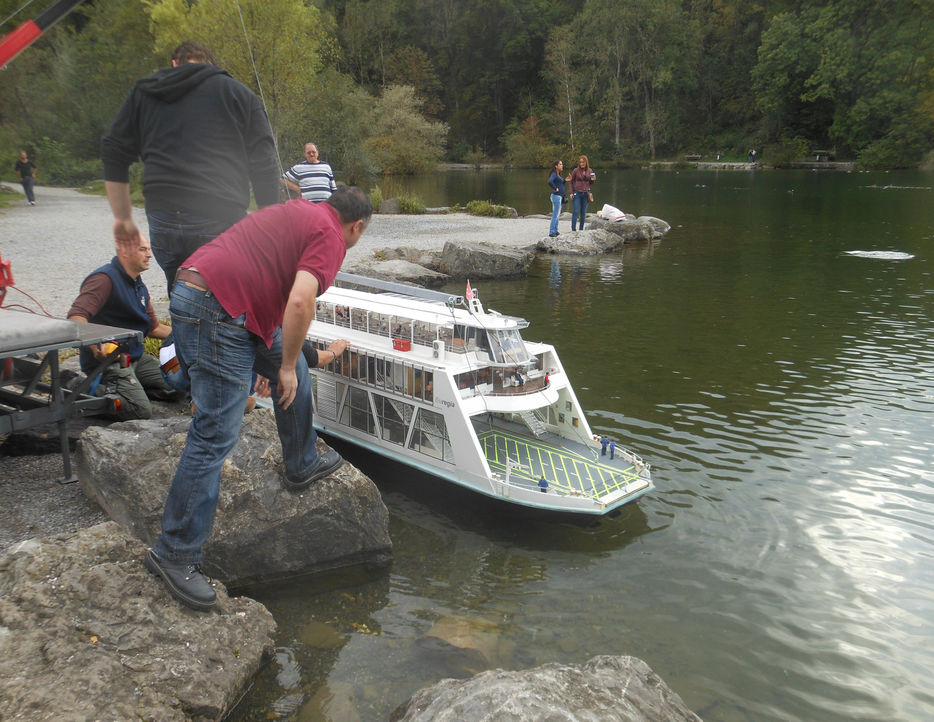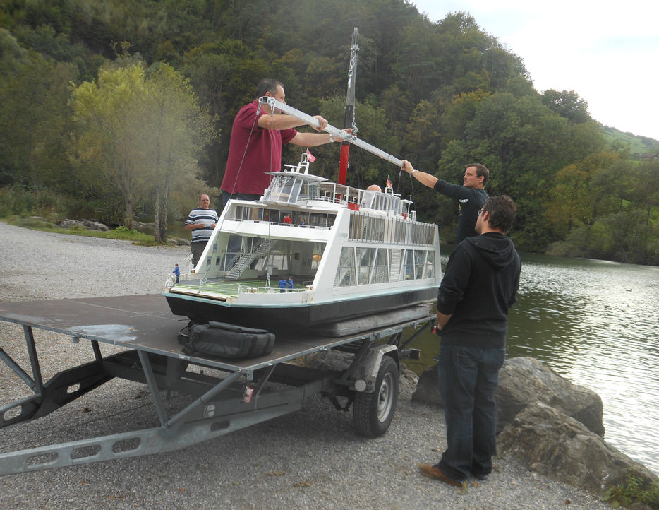 Hier ist die Fähre das erste mal in ihrer natürlichen Umgebung. Wir haben es gewagt, den ganzen Aufwand auf uns zu nehmen, und der ist gross!