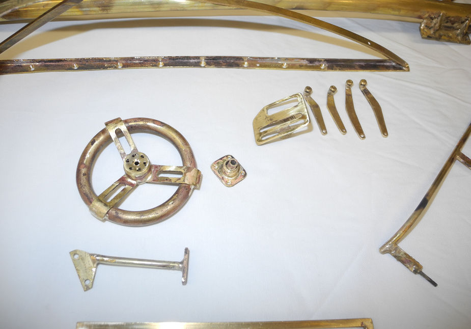 Jetzt werden die ganzen Anbauteile aus Messing hergestellt, wie Steuerrad, Überrollbügel, Haltegriffe usw.